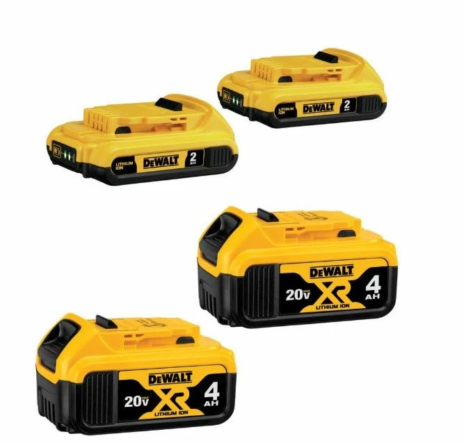 The DCB324-4 20V MAX* lithium ion battery 4-pack includes two DCB204 20V MAX* XR 4Ah batteries and two DCB203 20V MAX* compact 2Ah batteries. These batteries are compatible with our full range of DEWALT 20V MAX* tools and chargers. With DCB324-4, cover a range of cordless applications from heavy duty to precision. All batteries include Fuel Gauge LED charge indicators and 3-year limited warrantyThe DCB324-4 20V MAX* lithium ion battery 4-pack includes two DCB204 20V MAX* XR 4Ah batteries and two DCB203 20V MAX* compact 2Ah batteries. These batteries are compatible with our full range of DEWALT 20V MAX* tools and chargers. With DCB324-4, cover a range of cordless applications from heavy duty to precision. All batteries include Fuel Gauge LED charge indicators and 3-year limited warranty.