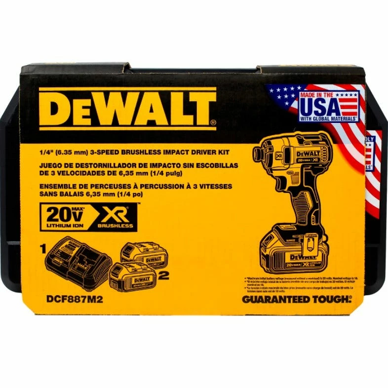 - Includes 1 DCF887 20-volt MAX XR 1/4-in 3-speed impact driver, two 4.0-Ah 20-volt MAX XR batteries, 1 fast charger, 1 belt hook. Made in the USA with global materials.
