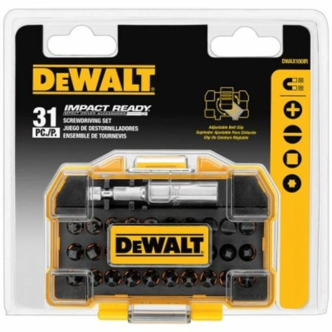 The DEWALT DWAX100IR 31-Piece Screw driving Extra Small Tough Case Set includes the Best In Class most common impact driver accessories. It also includes new patented PIVOT HOLDER, which drives straight or in pivot mode. This set is ideal for any applications where impact drivers are used.